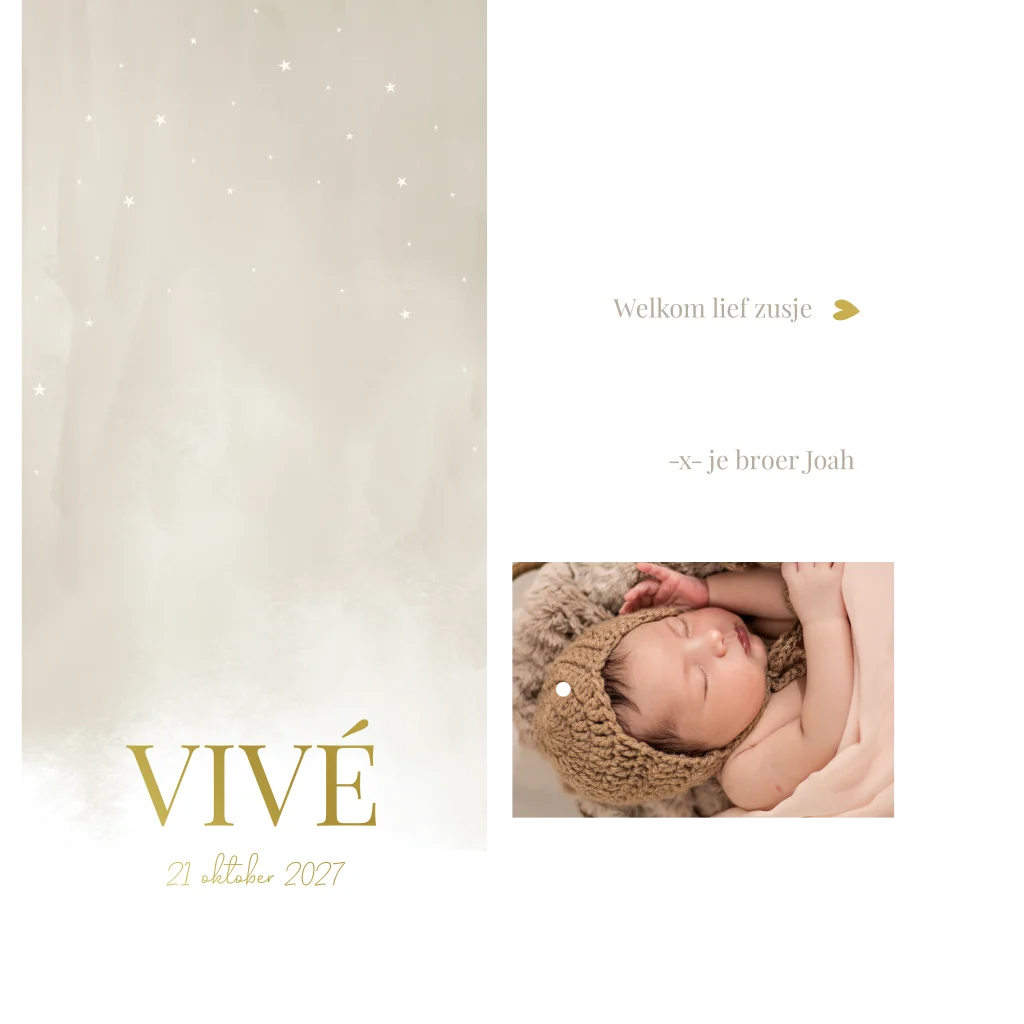 Een enkel, langwerpig geboortekaartje met daaraan twee losse labels en een fotokaartje. De losse labels en het fotokaartje zijn voorzien van een gaatje waar je een mooi touwtje of lintje door kunt doen. Het kaartje is aan de voor- en achterzijde afgewerkt met foliedruk.