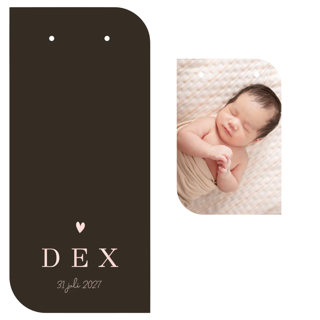 Een enkel geboortekaartje met ronde hoeken en spotlak. Het kaartje heeft een los fotolabel dat ook ronde hoeken heeft. Door de gaatjes in beide kaarten kun je ze door middel van een touwtje of lintje aan elkaar bevestigen.