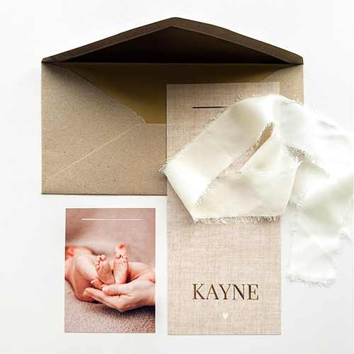 Een enkel, langwerpig geboortekaartje met daaraan een los fotokaartje. Het kaartje en het losse fotokaartje zijn voorzien van een opening waar je een mooi breed lintje door kunt doen. Het kaartje is aan de voorzijde afgewerkt met foliedruk.