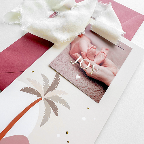 Geef het leven een mooie start met dit unieke geboortekaartje in palm boom stijl! Het kaartje is gemaakt van hoogwaardig materiaal en afgewerkt met goudfolie, wat het een luxe uitstraling geeft. Het ontwerp is stijlvol en trendy, perfect voor een klein mensje. De bloemen op het kaartje zijn prachtig aquarel en geven het een romantische sfeer.