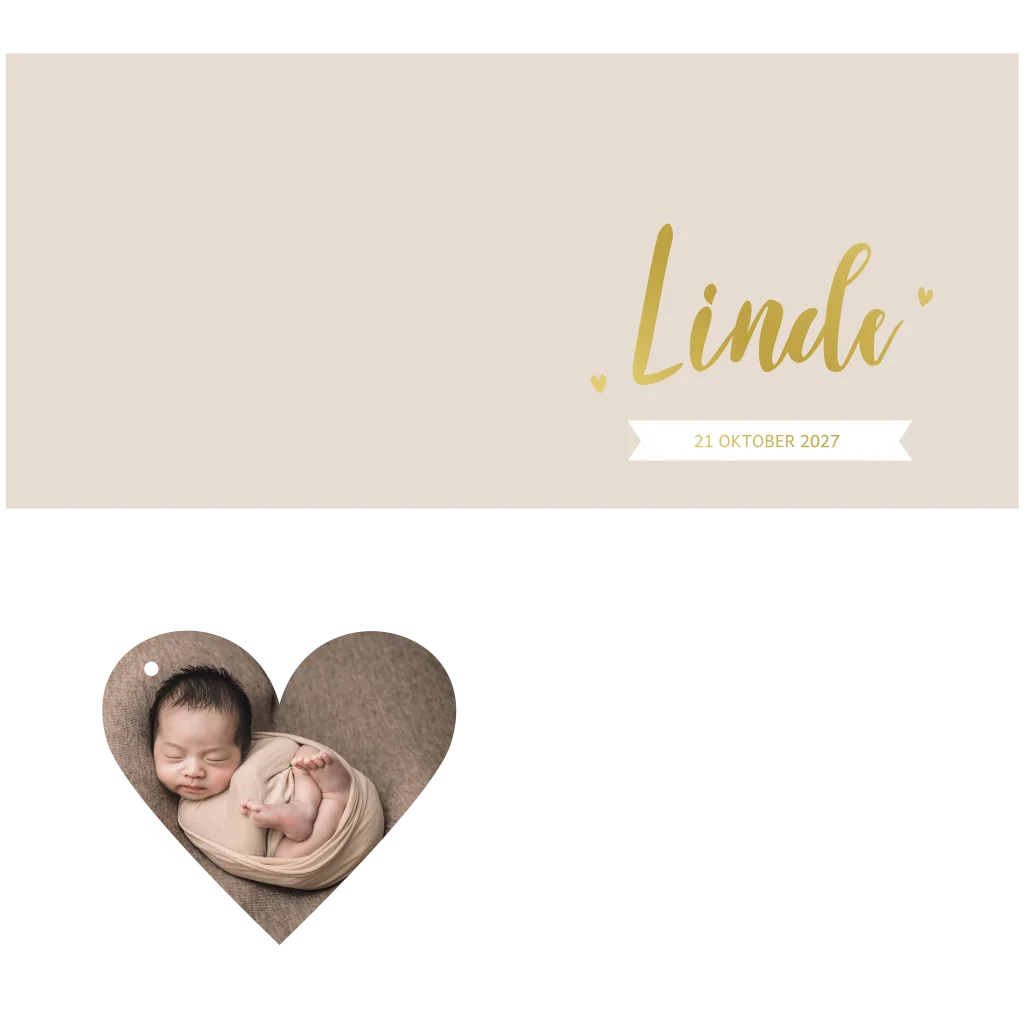Een liggend geboortekaartje met een hartjeslabel voor een foto. Het label heeft een gaatje waar je een mooi touwtje of lintje doorheen kunt doen.