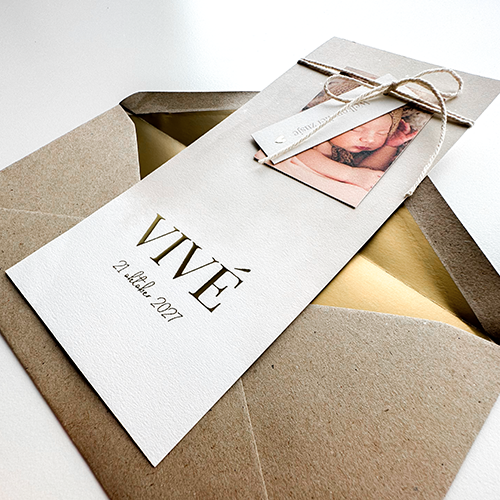 Een enkel, langwerpig geboortekaartje met daaraan twee losse labels en een fotokaartje. De losse labels en het fotokaartje zijn voorzien van een gaatje waar je een mooi touwtje of lintje door kunt doen. Het kaartje is aan de voor- en achterzijde afgewerkt met foliedruk.
