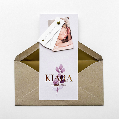 Een enkel, langwerpig geboortekaartje met daaraan twee losse labels en een fotokaartje. De kaart, losse labels en het fotokaartje zijn voorzien van een gaatje waar je een splitpen door kunt doen. Het kaartje is aan de voor- en achterzijde afgewerkt met foliedruk.
