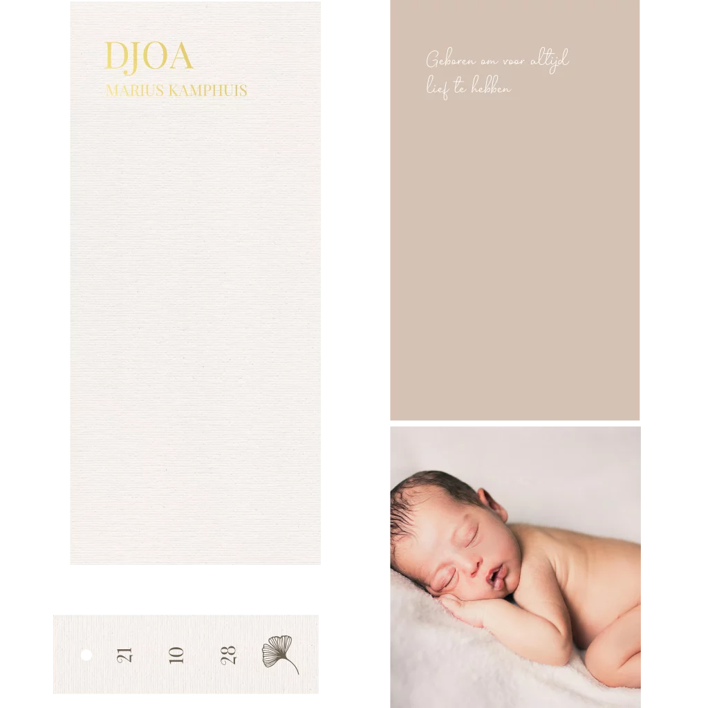 Langwerpig geboortekaartje met folie, losse delen en tekstlabel