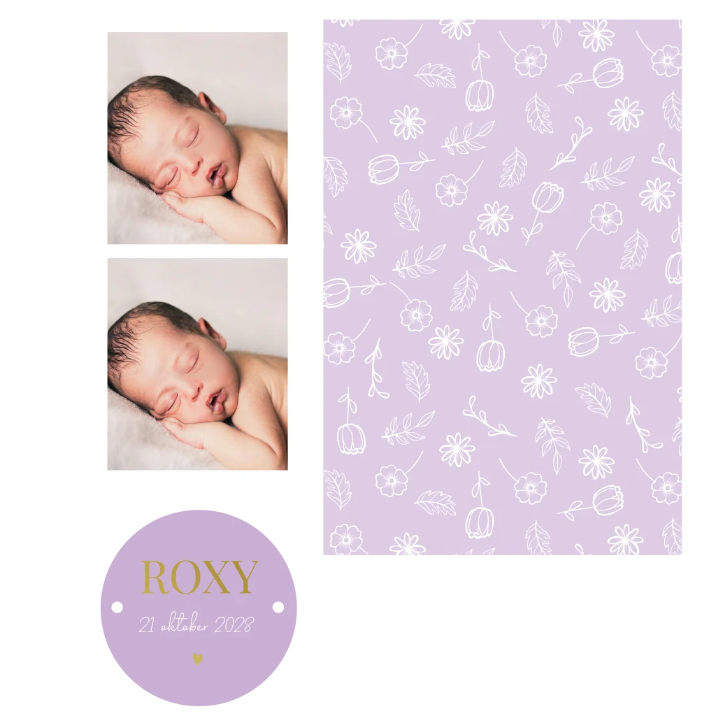 Een rechthoekig, driedelig geboortekaartje dat je kunt stapelen. Het ronde label heeft een gaatje zodat je de kaartjes kunt verbinden met een touwtje of lintje. Het touw of lint zit er niet standaard bij, dit kun je apart mee bestellen via de pagina 'extra's'.