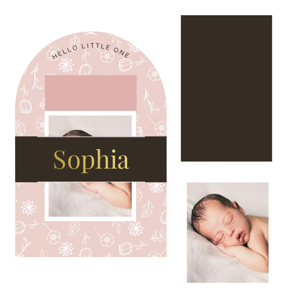 Een enkel geboortekaartje in een mooie boogvorm. Het kaartje heeft 2 openingen waar de twee losse kaartjes doorheen kunnen. Om er voor te zorgen dat ze er niet uitzakken zit er ook een klein openingetje onderin de kaart. Het geboortekaartje is naar wens aan te passen.
