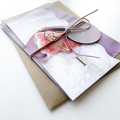 Een uniek geboortekaartje dat bestaat uit drie delen. Verbind de delen met een mooi touwtje of lintje en hang het ronde label er aan.