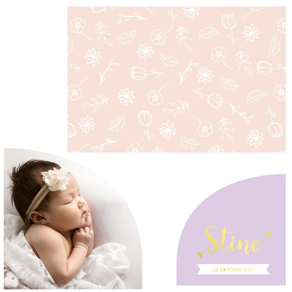 Een lief, enkel geboortekaartje met een losse foto en naamkaartje in een boogvorm. Het gehele kaartje is naar wens aan te passen.