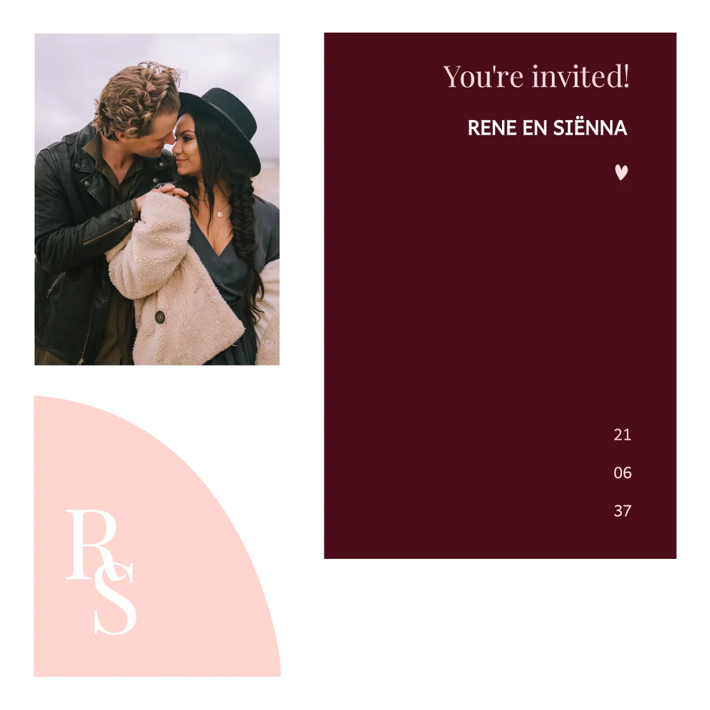 Een enkele stapelkaart met spot UV lak. Het kaartje bevat een losse foto en een kaartje met initialen. Het gehele ontwerp is naar wens aan te passen.
