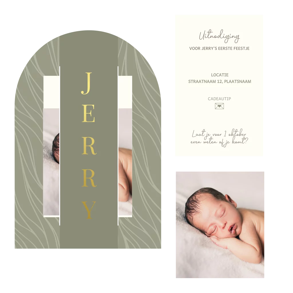Een uniek geboortekaartje met boogvorm en een insteek waar je losse labels in kunt steken. Het kaartje heeft een foto en is afgewerkt met foliedruk.