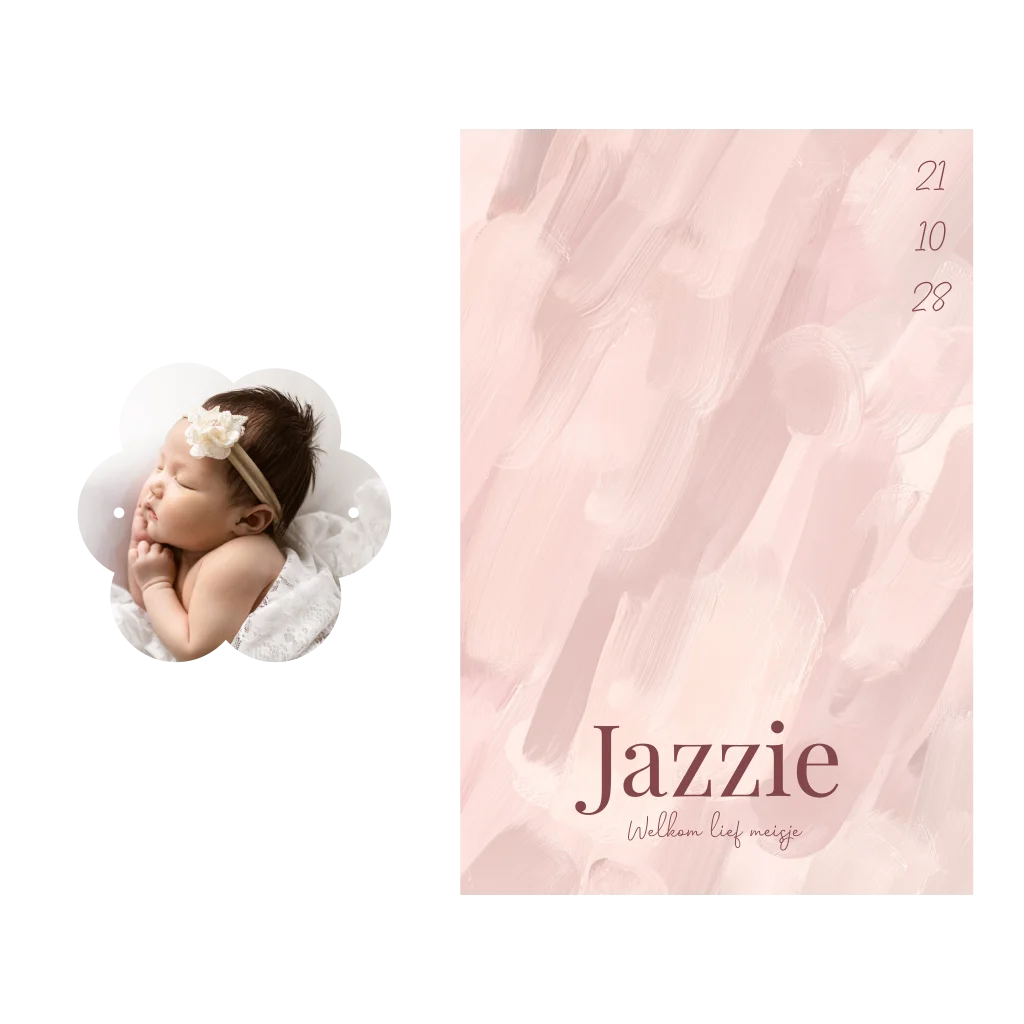 Geboortekaartje met foto in bloemetjesvorm en verfstrepen