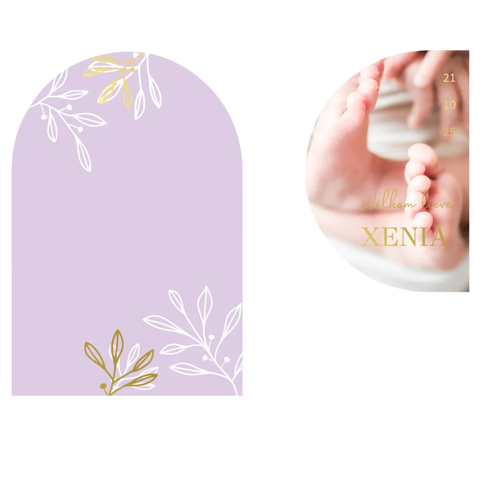 Een enkel geboortekaartje in de vorm van een boog, Bij het kaartje zit in dezelfde vorm een losse foto. Het kaartje en de foto zijn allebei afgewerkt met goudfolie. Het kaartje is in zijn geheel aan te passen.
