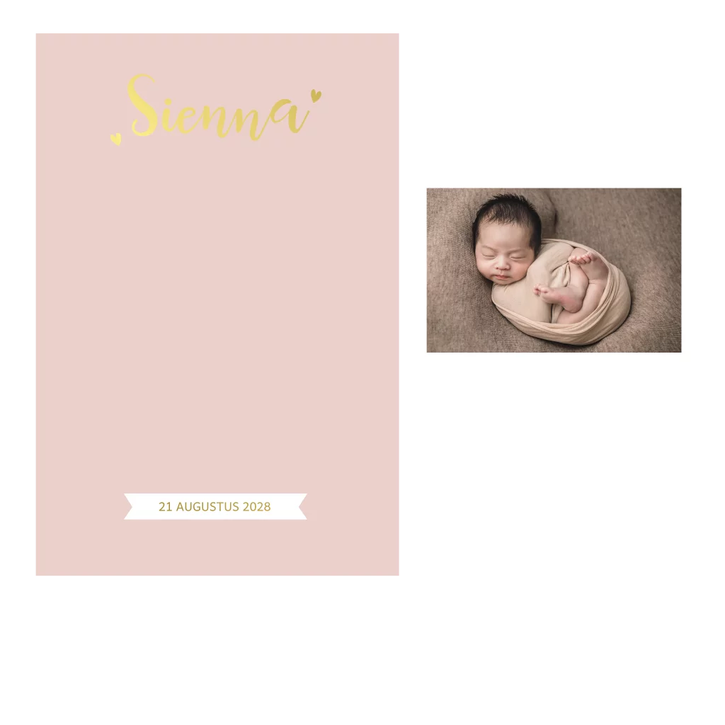 Op zoek naar een prachtig geboortekaartje voor jullie dochter? Dit kaartje is een uniek en luxe ontwerp. Met prachtige details zoals foliedruk en een minimalistisch en klassiek ontwerp, zal dit geboortekaartje zeker de aandacht trekken. De rustige en lieflijke uitstraling maakt dit geboortekaartje perfect voor ouders die op zoek zijn naar een origineel en stijlvol geboortekaartje voor hun meisje. Het toevoegen van een losse foto geeft het geboortekaartje een extra luxe uitstraling, waardoor het een blijvende herinnering wordt aan de geboorte van jullie dochter.