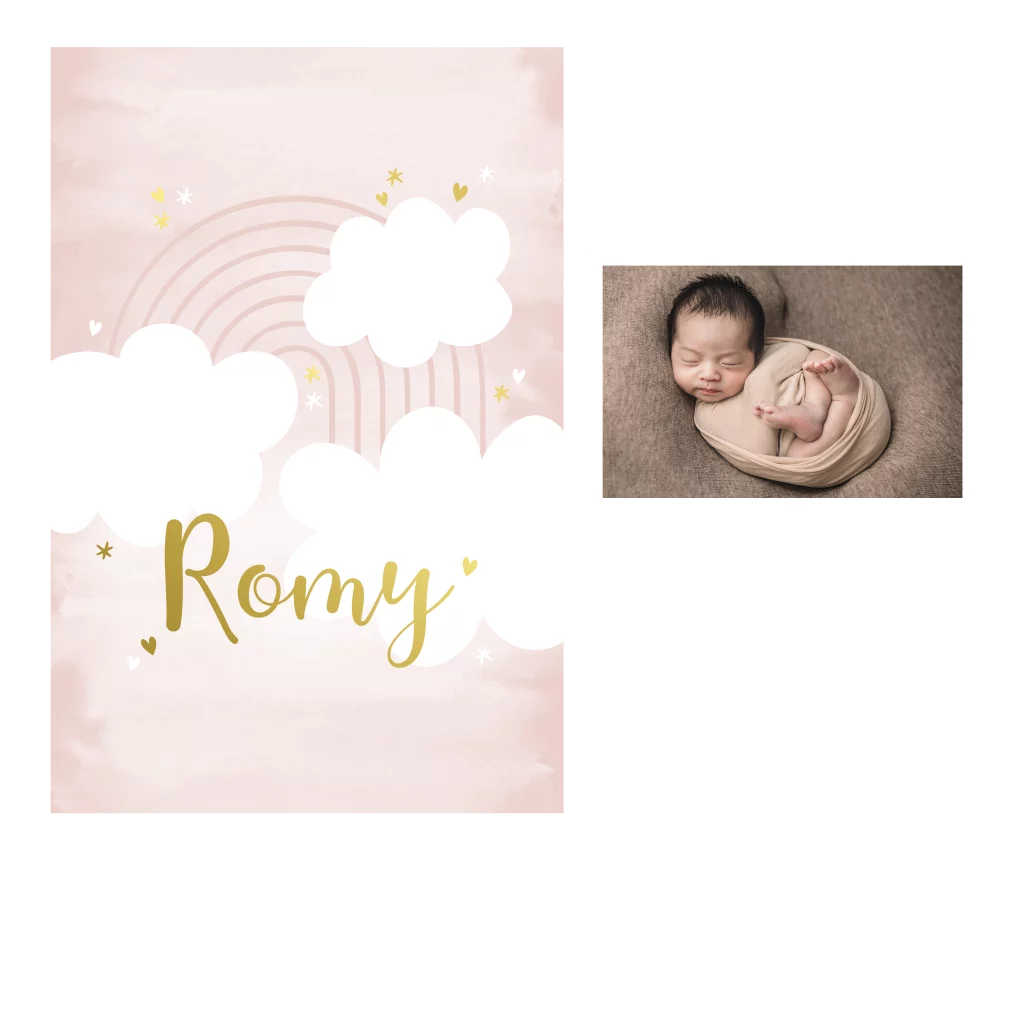 Lief geboortekaartje met regenboog, wolkjes, foliedruk met losse foto