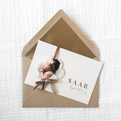 Een lief, enkel geboortekaartje met een losse foto in de vorm van een bloemetje. De letters op de voorkant van het kaartje zijn afgewerkt met sport UV lak. Het gehele kaartje is naar wens aan te passen.