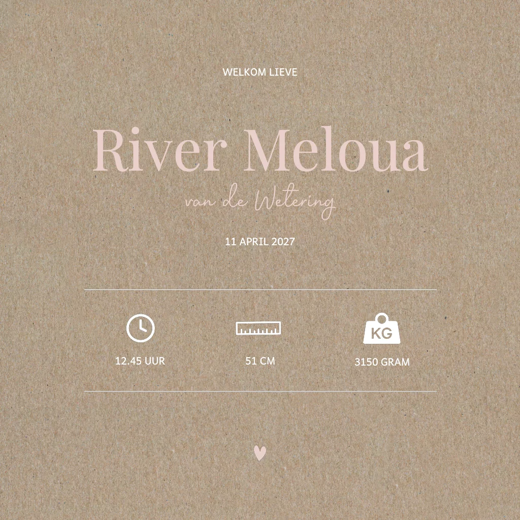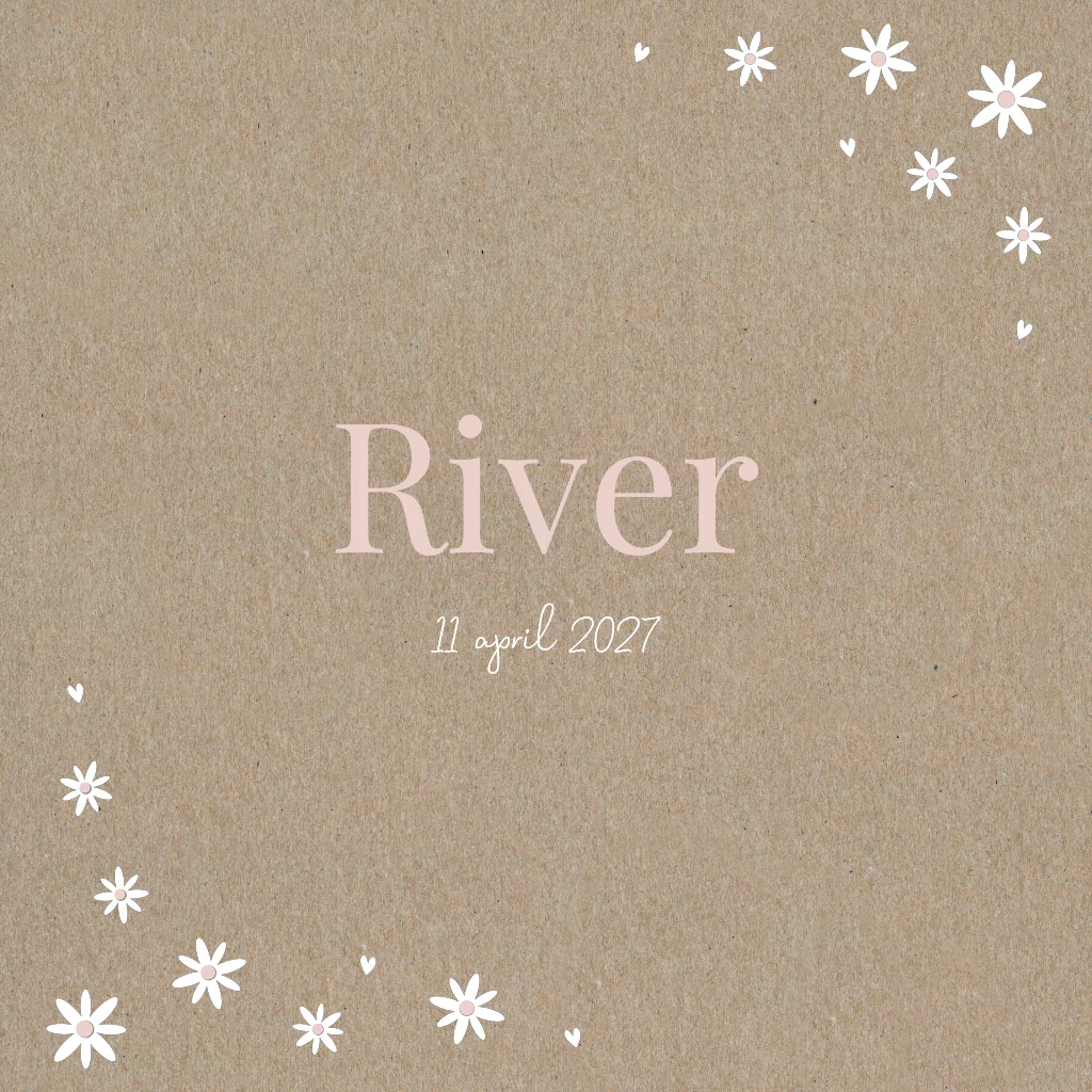 Een vierkant gevouwen geboortekaartje van kraftpapier en witte bloemetjes. Het kaartje is naar wens aan te passen.