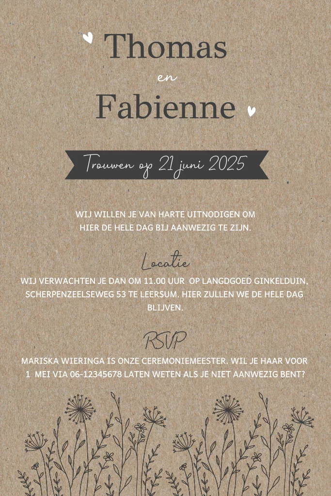 Trouwkaart op kraftpapier met takjes en witte inkt