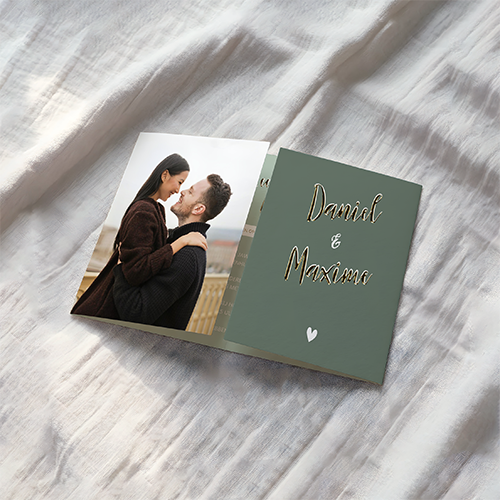 Het elegante luikvouw ontwerp opent als een klein verhaal: aan de buitenzijde kan een prachtige foto van jullie samen schitteren, terwijl aan de binnenkant alle details van jullie bruiloft overzichtelijk en stijlvol worden gepresenteerd. De verfijnde goudfoliedruk laat namen, datum of subtiele accenten stralen en geeft de kaart een chique, luxe afwerking.