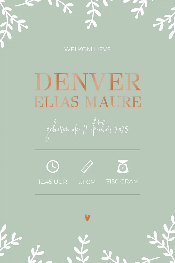 Een stoere geboorteposter die ook heel mooi matcht bij het pocketfoldkaartje 'Denver'. Je kunt de kleur van de poster en de folie zelf naar wens aanpassen in de editor.