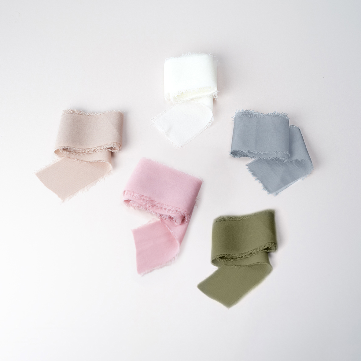 Sampleset van vier kleuren chiffon zijden lint: beige, ecru, oudroze en saliegroen.