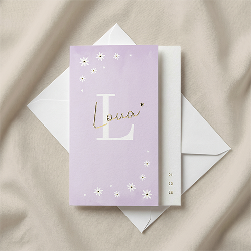 Vrolijk lila geboortekaartje met smalle voorkant en foliedruk