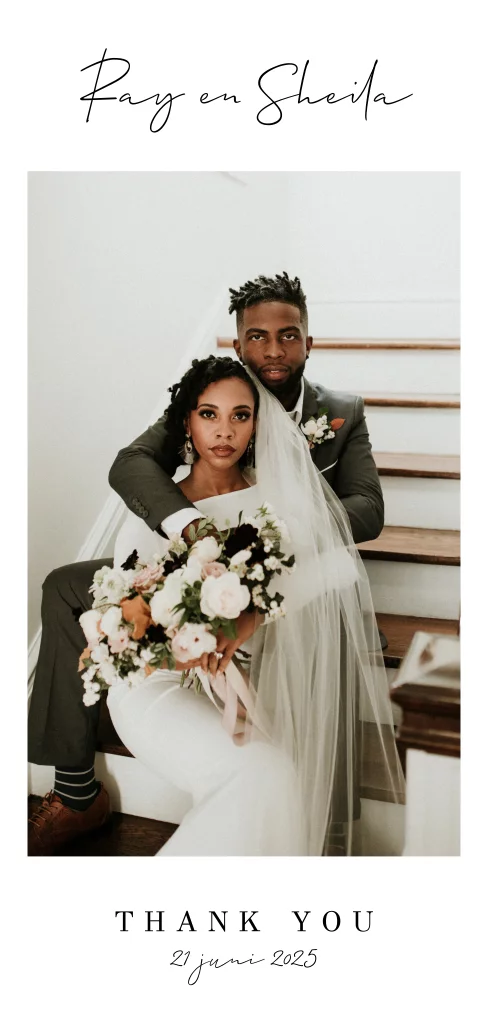 Een langwerpig, enkel bedankkaartje met daarop een foto welke te vervangen is. Het kaartje is in zijn geheel naar wens aan te passen.