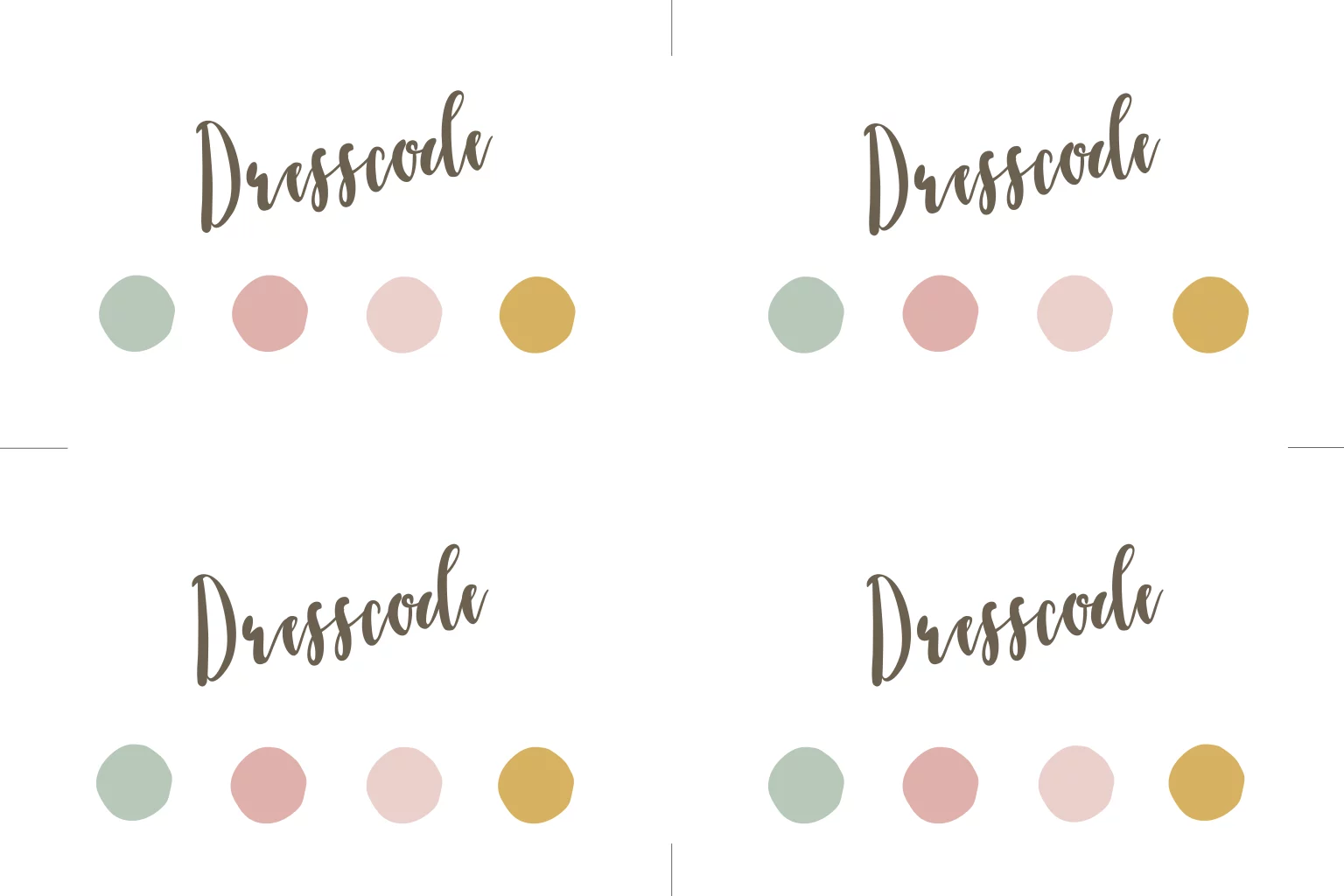 Een kaart met daarop 4 DIY dresscode labels. Vervang de kleuren en snij de kaartjes los van elkaar.