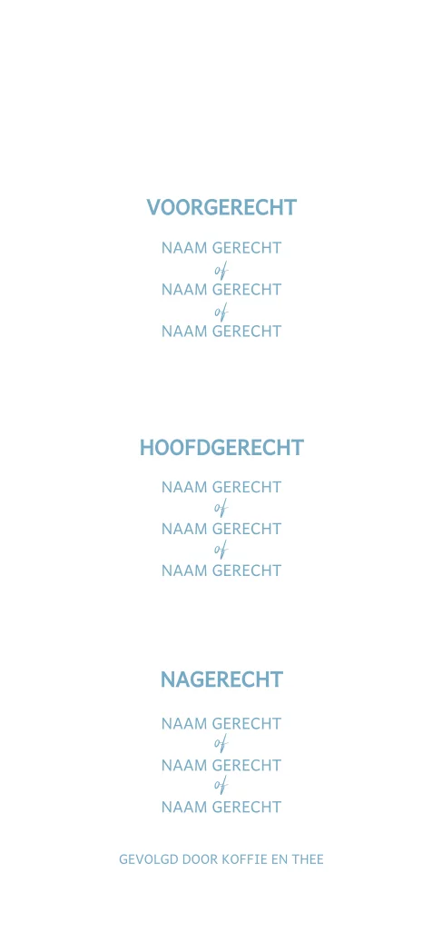 Een langwerpige menukaart met ronde hoeken en afgewerkt met foliedruk. De menukaart is helemaal naar wens aan te passen en kan bijpassen bij jullie trouwkaart gemaakt worden.