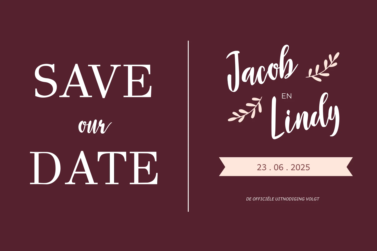 Een liggend save the date kaartje met takjes en foliedruk. Op de achterkant is extra ruimte waar je nog meer tekst kwijt zou kunnen. Villa Pluis ontwerpt écht unieke en originele trouwkaarten, die je niet zo snel ergens anders zal vinden. Alle kaartjes zijn naar wens aan te passen. Dit kun je zelf doen met de handige online ontwerp editor, maar wij kunnen je ook (gratis) helpen. Bestel daarna snel een proefdruk om het kaartje in het echt te zien!