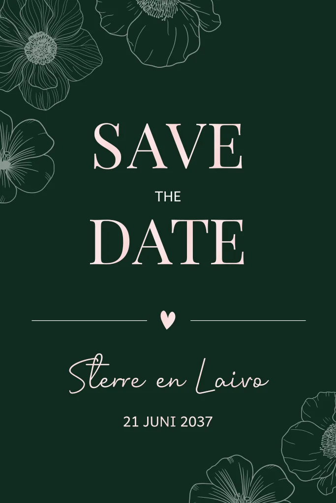 Een enkele save the date met getekende bloemen en roze spotlak. Het hele kaartje is naar wens aan te passen. Bij dit ontwerp kaart is er ook een bijpassende trouwkaart en menukaart.
