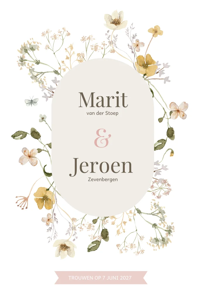 Een enkele trouwkaart met ronde hoeken en geschilderde bloemen. Op de achterkant van de kaart staat meer informatie. Je kunt de kaart eventueel aanvullen met losse labels of een programma.
