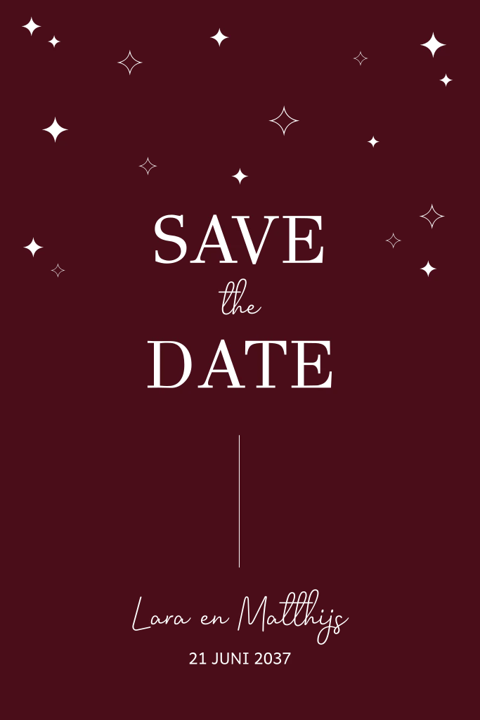 Een enkele save the date met rode tinten en holografische folie. Het hele kaartje is naar wens aan te passen.