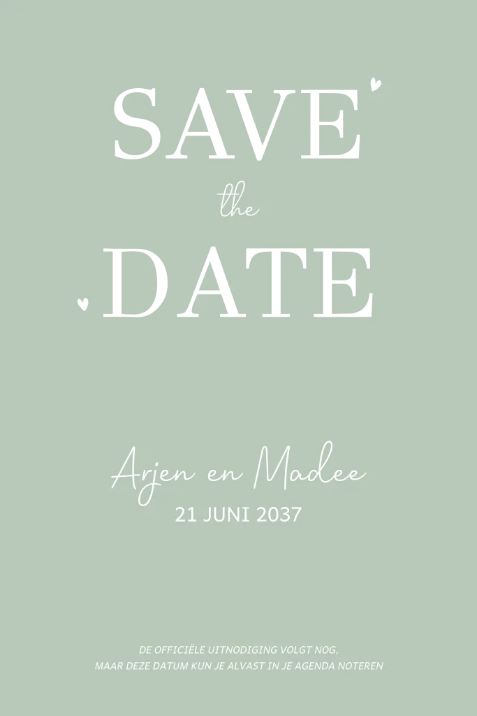 Een enkel save the date kaartje met groene kleur. Het kaartje is afgewerkt met goudfolie en het heeft ronde hoeken.