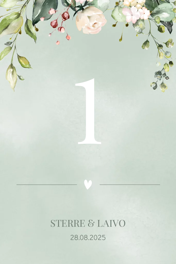 Een enkel tafelnummer kaartje met bloemen, groene tinten en rosefolie. Het hele kaartje is naar wens aan te passen. Bij dit ontwerp kaart is er ook een bijpassende save the date, trouwkaart en menukaart.