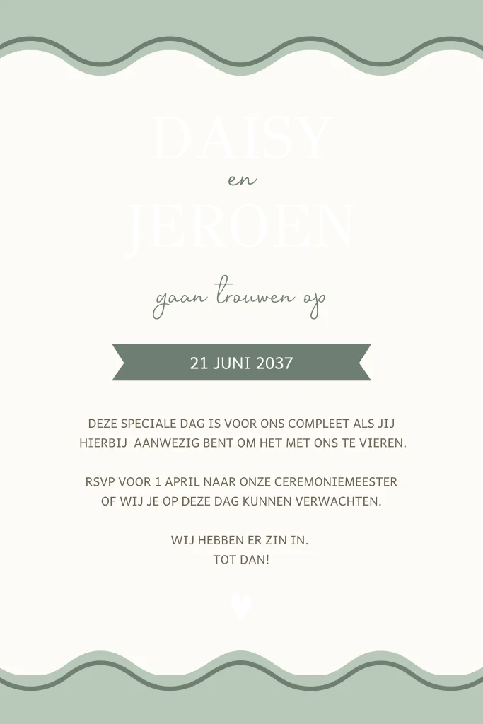 Een enkele trouwkaart met golfrandje, neutrale tinten en goudfolie. Het hele kaartje is naar wens aan te passen. Bij dit ontwerp kaart is er ook een bijpassende save the date.