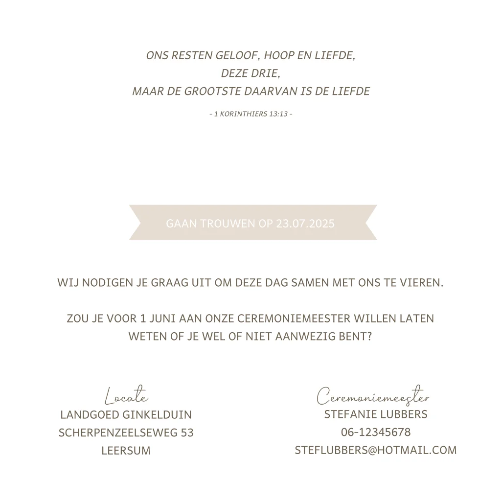 Een vierkant gevouwen trouwkaart op een foto. De foto kun je vervangen voor jullie eigen foto. De binnenkant kant van de kaart heeft een programma en kun je zelf naar wens aanpassen. Villa Pluis ontwerpt écht unieke en originele trouwkaarten, die je niet zo snel ergens anders zal vinden. Alle kaartjes zijn naar wens aan te passen. Dit kun je zelf doen met de handige online ontwerp editor, maar wij kunnen je ook (gratis) helpen. Bestel daarna snel een proefdruk om het kaartje in het echt te zien!