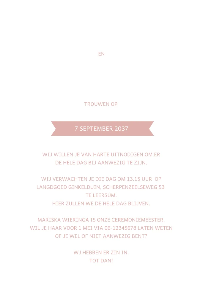 Op zoek naar een prachtige trouwkaart die echt opvalt? Ontdek deze gevouwen trouwkaart op een mooie roze achtergrond met foliedruk. Deze dubbelgevouwen kaart is niet alleen kleurrijk en opvallend, maar straalt ook elegantie uit. De foliedruk voegt een vleugje luxe toe aan het ontwerp, waardoor deze kaart perfect is voor stellen die op zoek zijn naar iets bijzonders voor hun grote dag. De binnenkant van de kaart biedt voldoende ruimte voor extra tekst, zoals een gedicht, een liefdesverhaal of zelfs een programma voor de bruiloft. Hierdoor kun je de kaart personaliseren en aanpassen aan jullie eigen wensen en behoeften.
