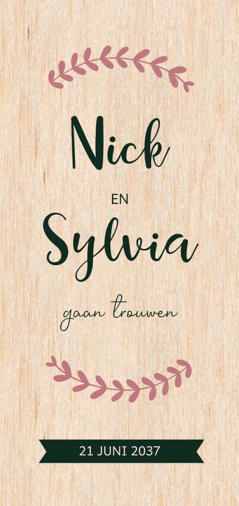 Langwerpige trouwkaart met groene en roze blaadjes op echt hout