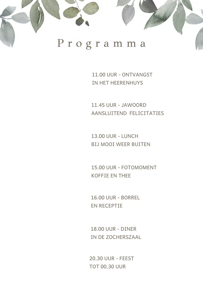 Een enkel, wit programma kaartje om in een pocketfold mapje te schuiven. Om de pocketfold compleet te maken zijn er ook nog het hoofdblad en de losse labels.