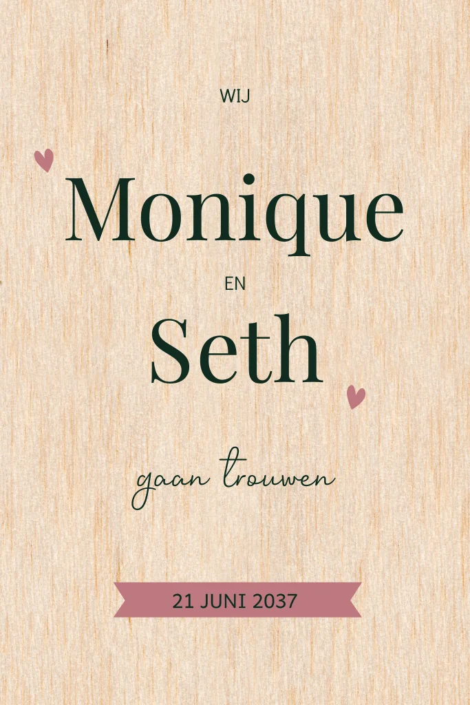 Een enkele trouwkaart op echt berkenhout. Het kaartje is in het geheel naar wens aan te passen.