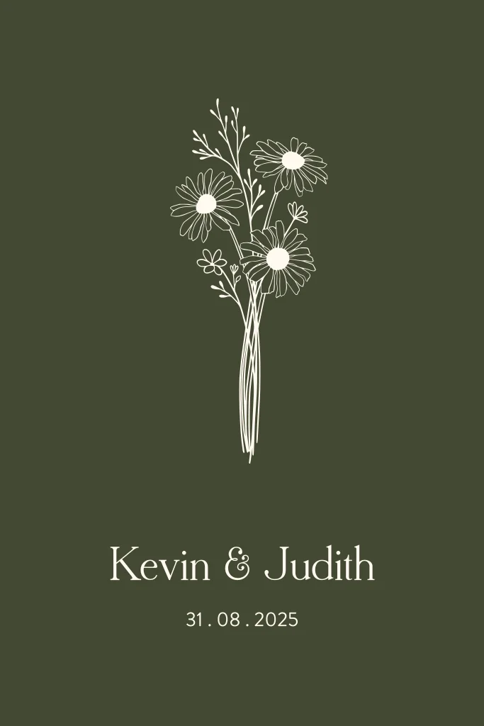 Een enkele, rechthoekige trouwkaart op echt hout. Het kaartje is voorzien van een donkergroene achtergrond en handgetekende bloemen. Het kaartje is afgewerkt met ronde hoeken en volledig naar wens aan te passen.