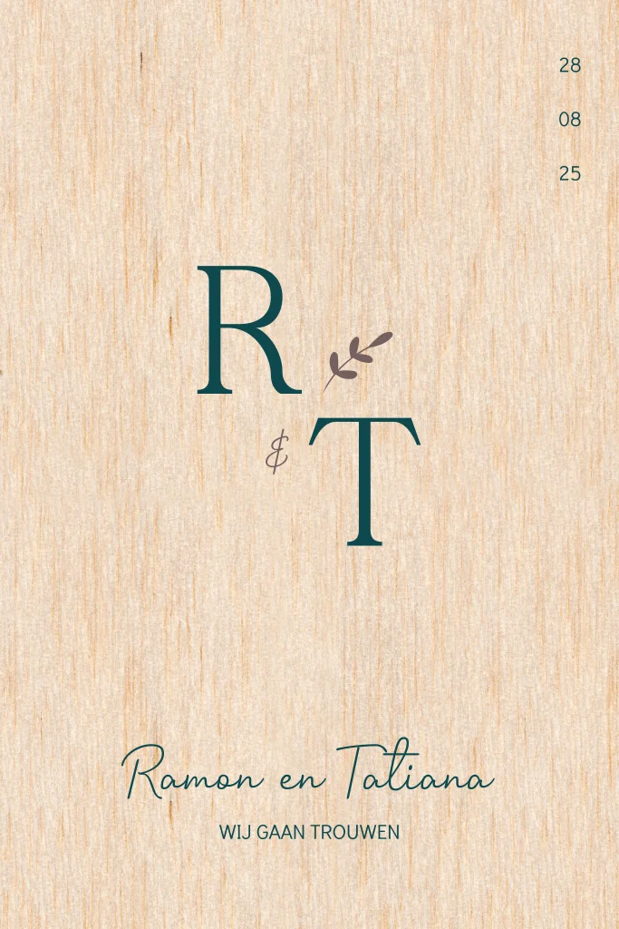 Trouwkaart met initialen en ronde hoeken op echt hout