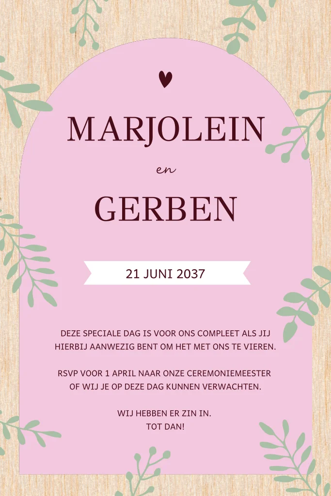 Een enkele trouwkaart met ronde hoeken. Het kaartje is gedrukt op echt hout. Het ontwerp is naar wens aan te passen. Bij dit ontwerp is er ook een bijpassende save the date, ook op hout.