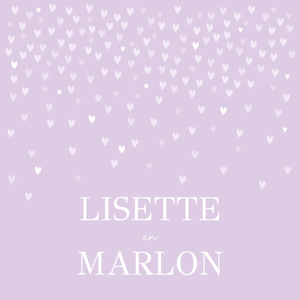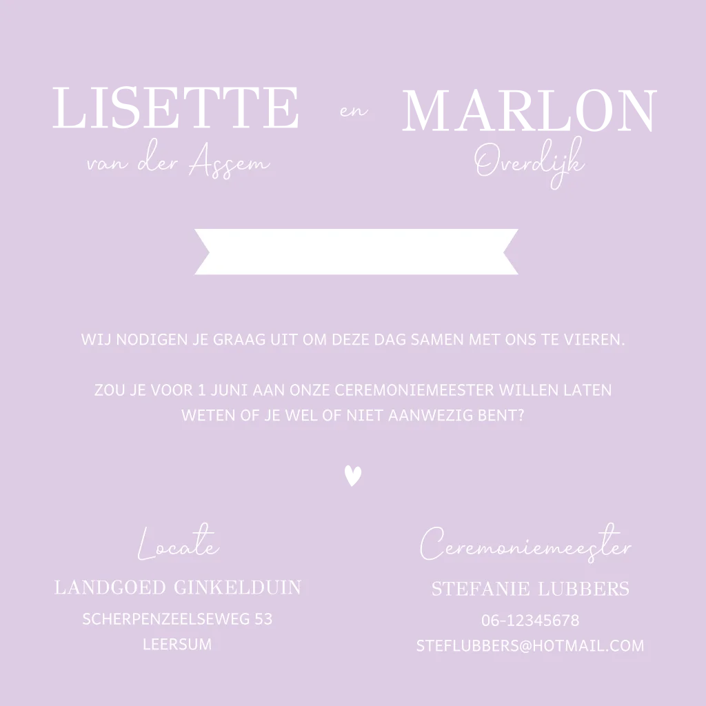 Een vierkant gevouwen trouwkaart met lila achtergrond. De binnenkant van de trouwkaart heeft een programma en kan je zelf naar wens aanvullen of bewerken. Villa Pluis ontwerpt écht unieke en originele trouwkaarten, die je niet zo snel ergens anders zal vinden. Alle kaartjes zijn naar wens aan te passen. Dit kun je zelf doen met de handige online ontwerp editor, maar wij kunnen je ook (gratis) helpen. Bestel daarna snel een proefdruk om het kaartje in het echt te zien!