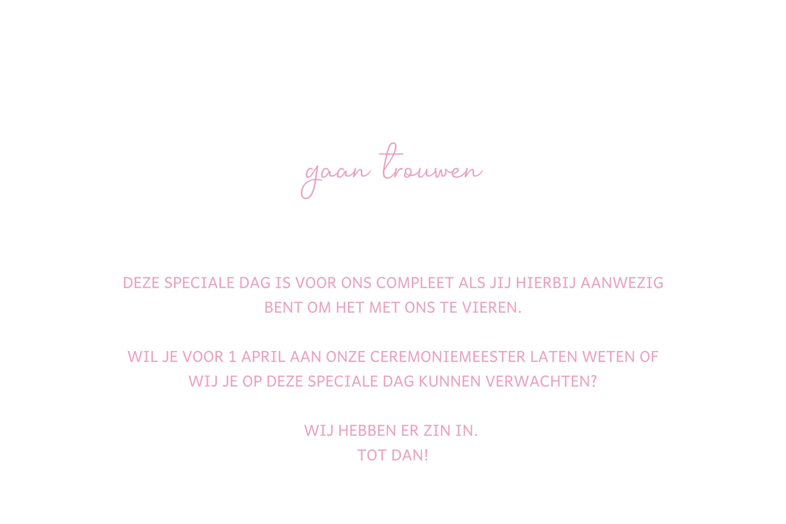 Een liggend, gevouwen trouwkaart met zachte kleuren. Het kaartje is aan allebei de kanten afgewerkt met foliedruk en is geheel naar wens aan te passen.