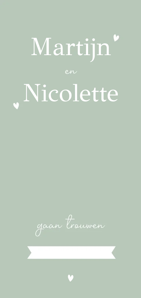 Een langwerpige, enkele trouwkaart met op de voorkant foliedruk. Op de achterkant staat het programma van de dag. Bij deze kaart kun je gebruik maken van de bijpassende losse labels.