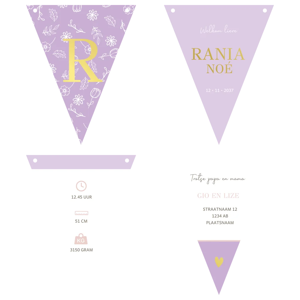 Lila vlaggetjeskaart met bloemetjes en goudfolie