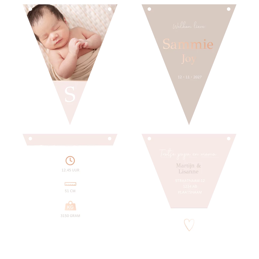 Een leuke vlaggetjeskaart met een foto en rosefolie. De foto kun je vervangen en het hele kaartje is naar wens aan te passen met behulp van de editor. Vind je dit lastig? Laat het even weten en het designteam helpt je graag verder.